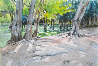 Hèctor, un model jove i ben plantat, va sostenir sense immutar-se una pose de peu dret -i solen ser poques-. És una altra aquarel·la que trobo agraciada. La pose em demanava tenir molta cura i que li fes justícia tot reflectint bé l'equilibri vertical