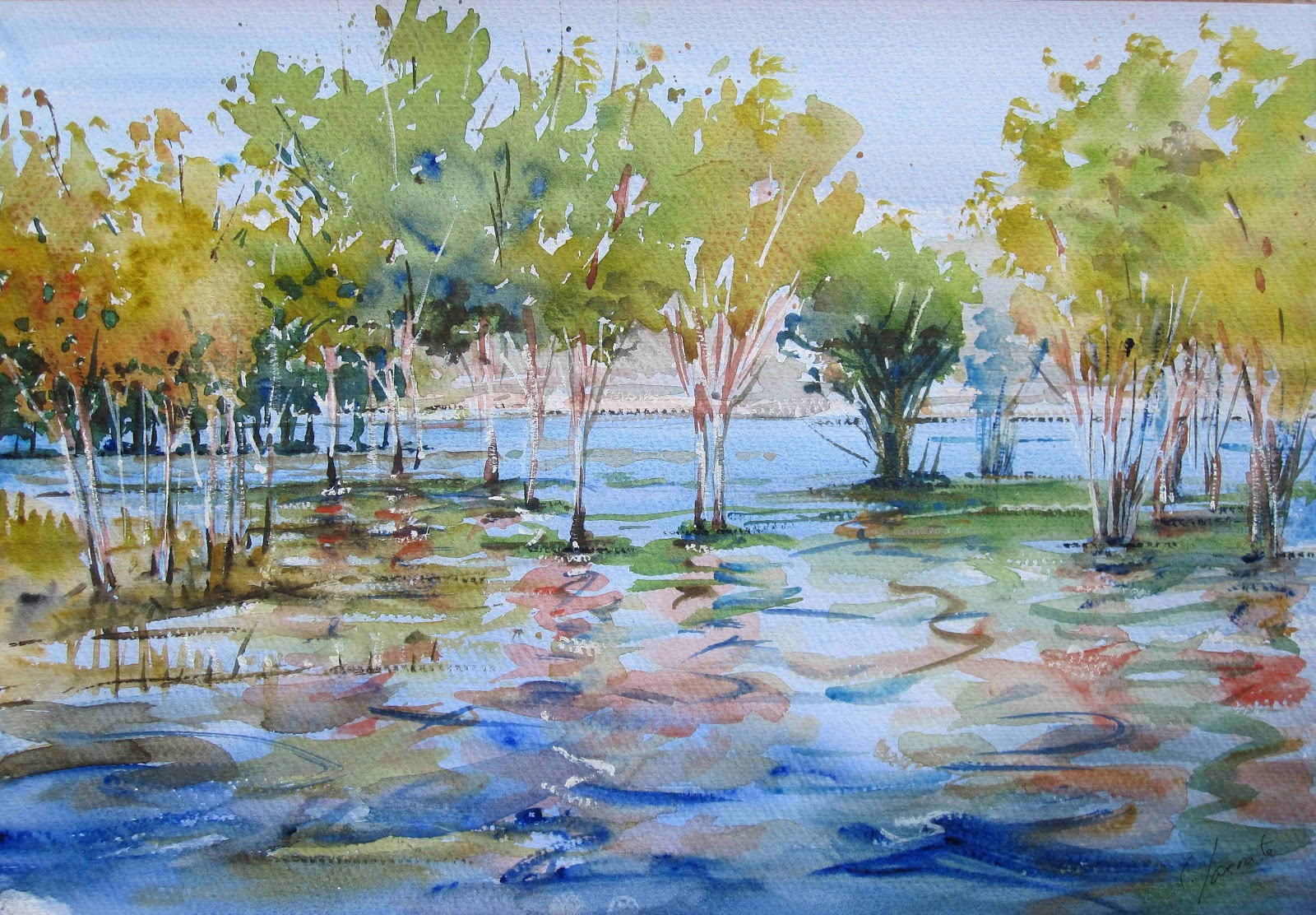 La superfície de les sitges està feta amb aquarel·les granulades, així com el fons d'arbres.